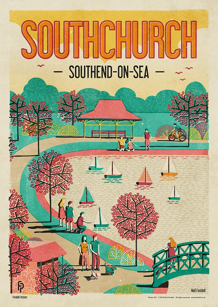 The final missing piece to my Southend Estuary stretch from Leigh-on-Sea to Shoeburyness - Southchurch! This is my 23rd Fendell Poster and it features the beautiful Southchurch Park and the model boating lake.